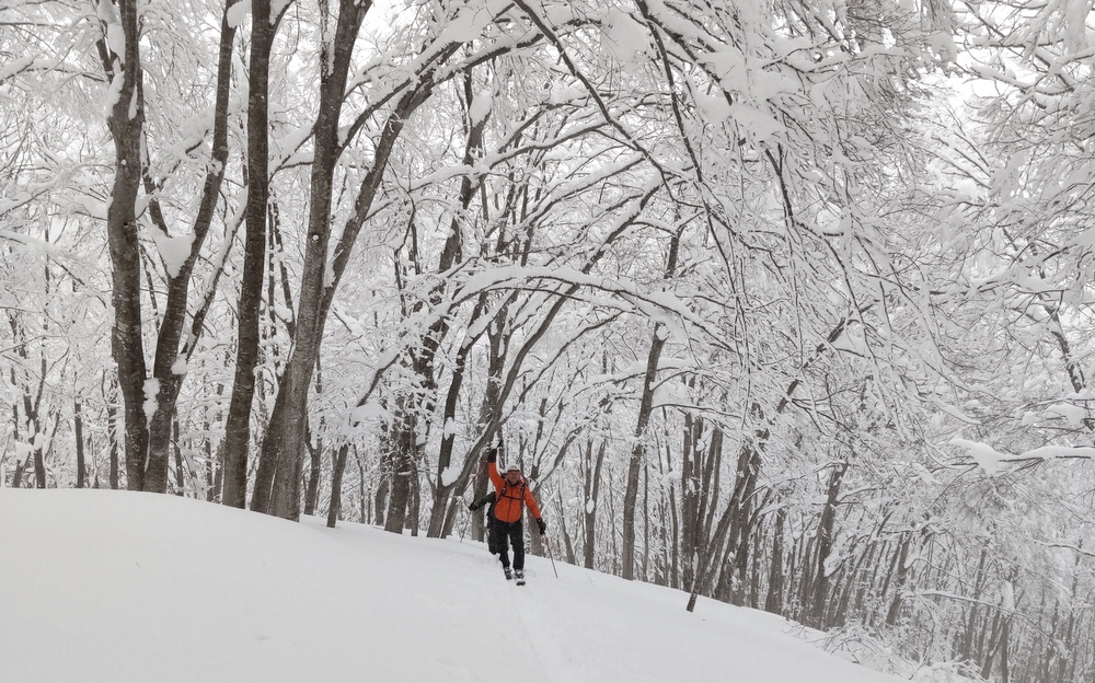 ゲレンデと違って静かやわ~~、でも静かすぎて先頭下りラッセル(みんなどこ行った!?)でドロップポイントへ