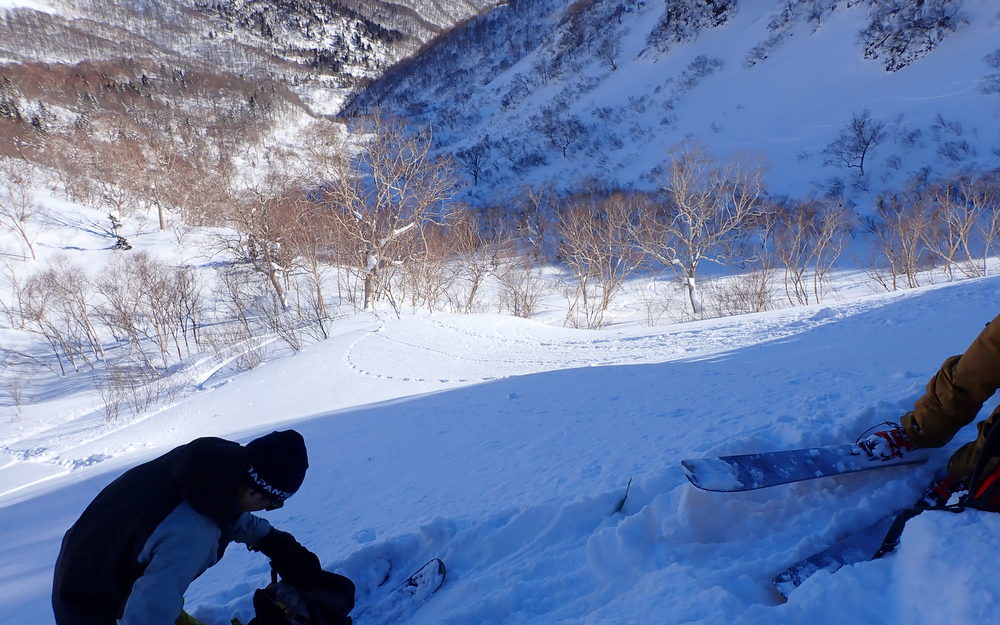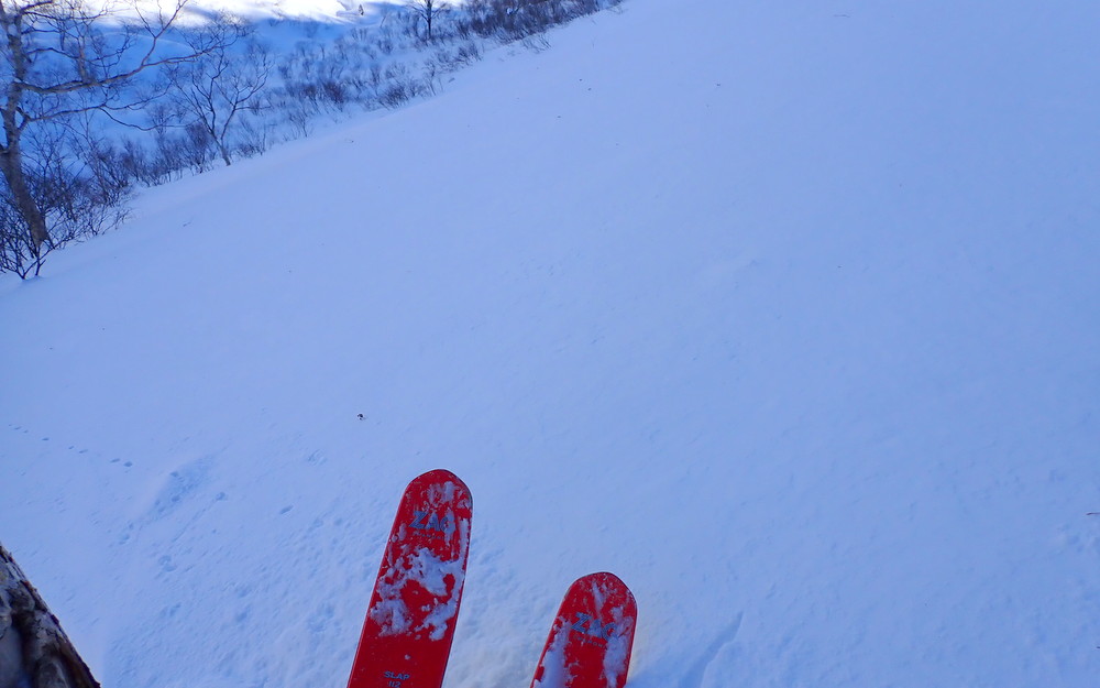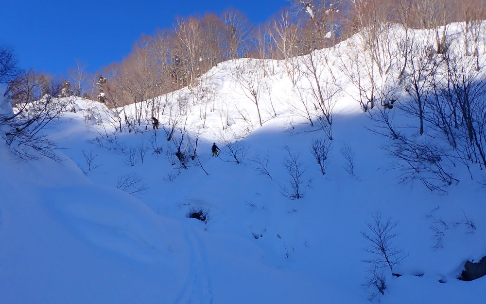 まだまだ良い雪あるし、またも普段は登らないラインを登ってもう1本へ